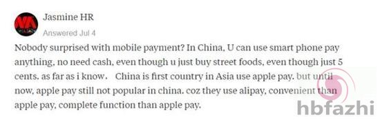 网友Jasmine HR:没人对移动支付感到震惊吗?在中国,你只要有手机就能买任何东西,完全不用现金,就算是买路边摊,就算只是要付半毛钱都能用手机。中国是亚洲最早开通苹果支付的国家,然而苹果支付在中国还是没普及。因为中国的支付宝实在是太方便了,功能还比苹果支付强大。